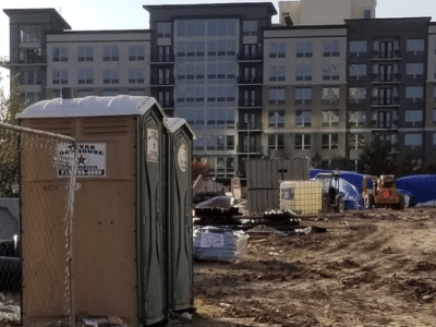 Construction portable toilets in use at a construction site in Houston